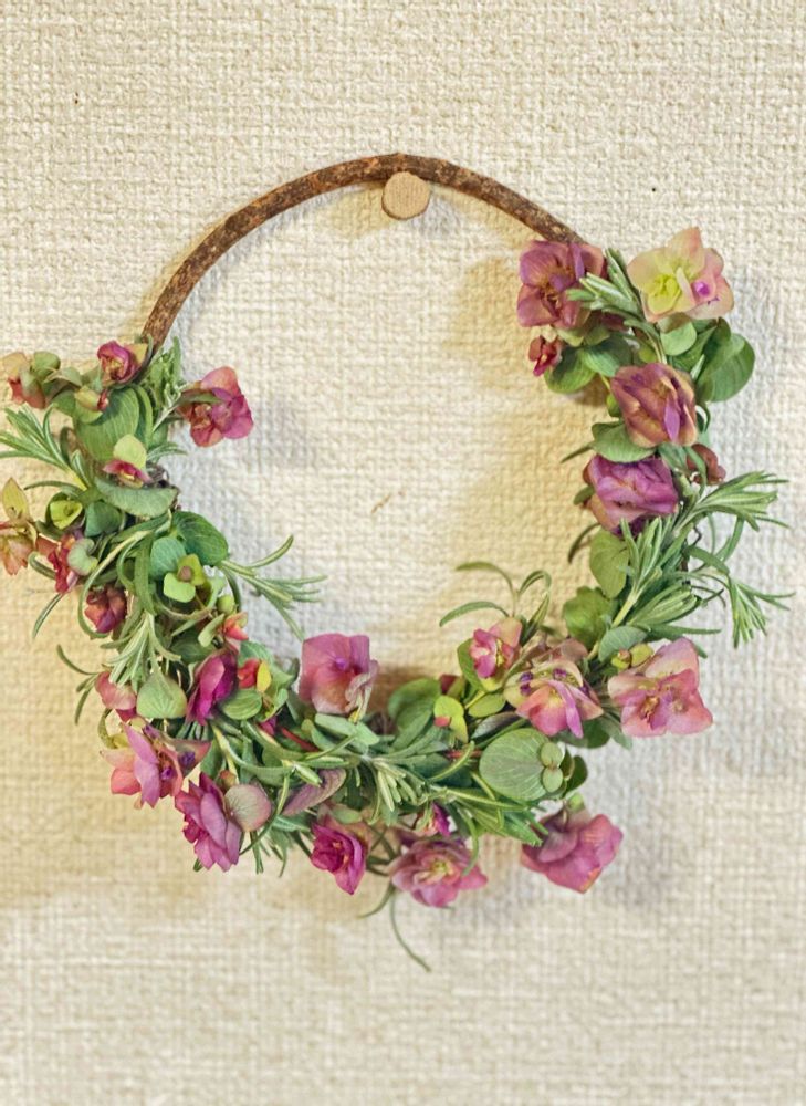 ピンクのお花がとっても可愛いかったので、オレガノとローズマリーでハンドルリース作りました💗💚