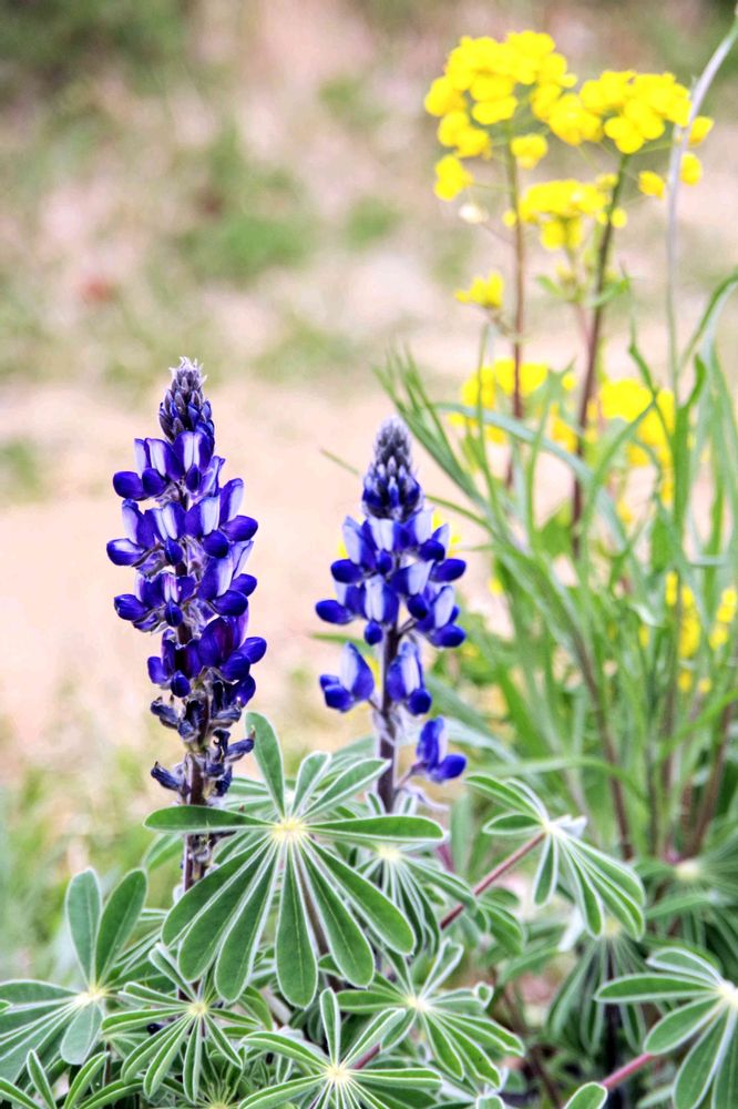 黄色の菜の花の中に濃いめ紫のルピナスが凛として綺麗です🥰