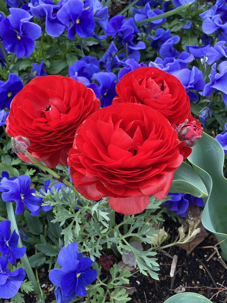 鮮やかな真っ赤のラナンキュラス❤️も、ブルーのビオラ💙に引き立てられています🍃