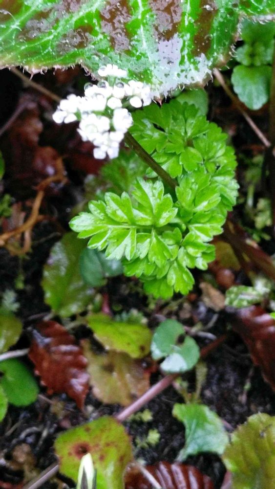 妻の実家の山でスミレを掘って持ち帰り植えた植木鉢に見たこと無い花が咲いてる・・・検索するとセントウソウと回答が