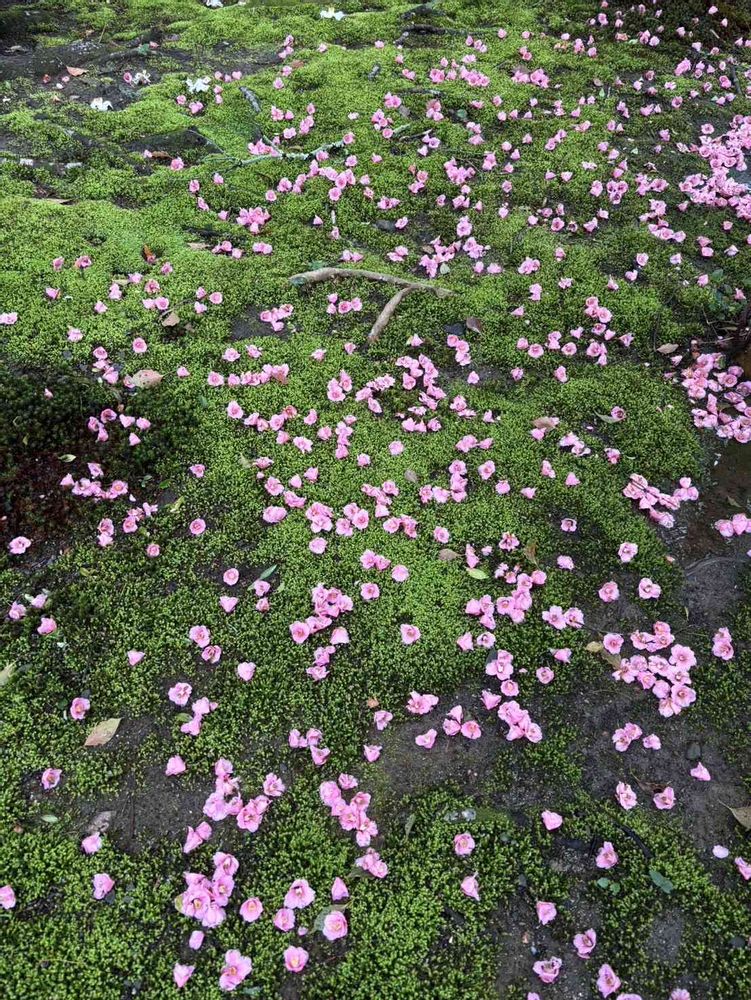 苔庭に上から椿さんが落ちてきて、芸術よねー🌸🌸🌸