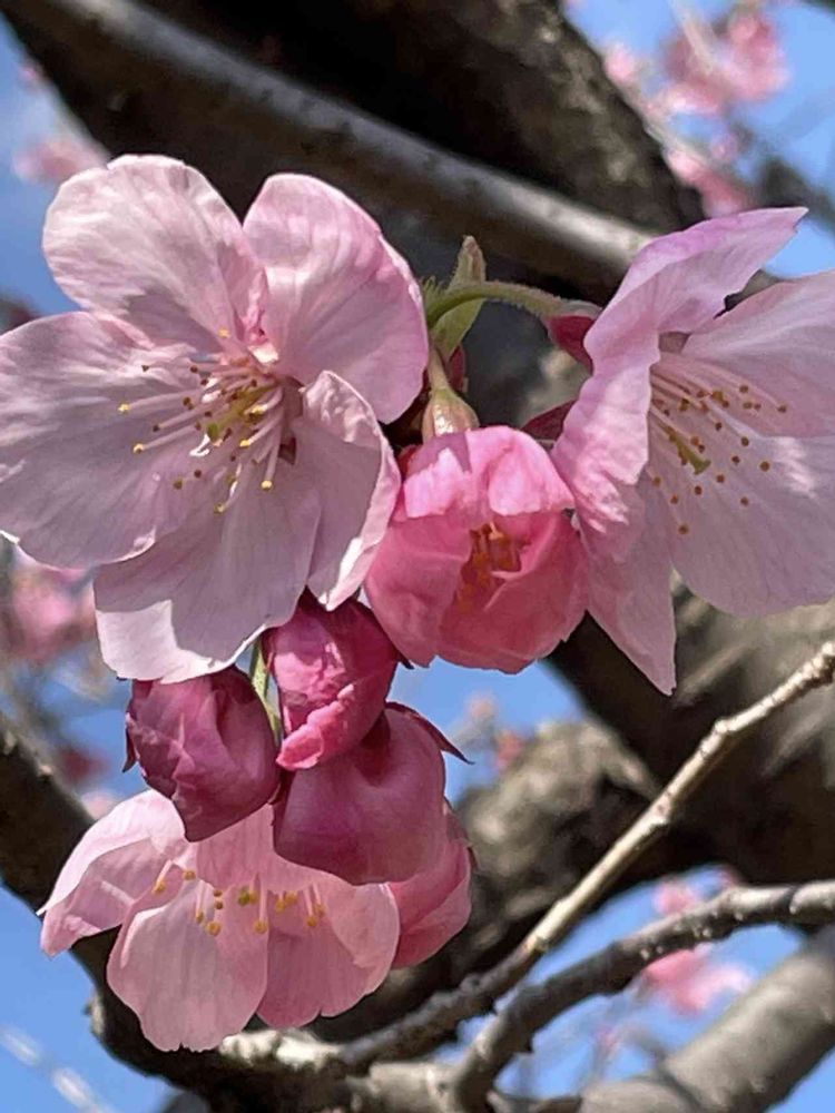 最寄りの駅近くの土手に数本のカンヒザクラ濃紅色の花を付け鮮やかにさいていました。