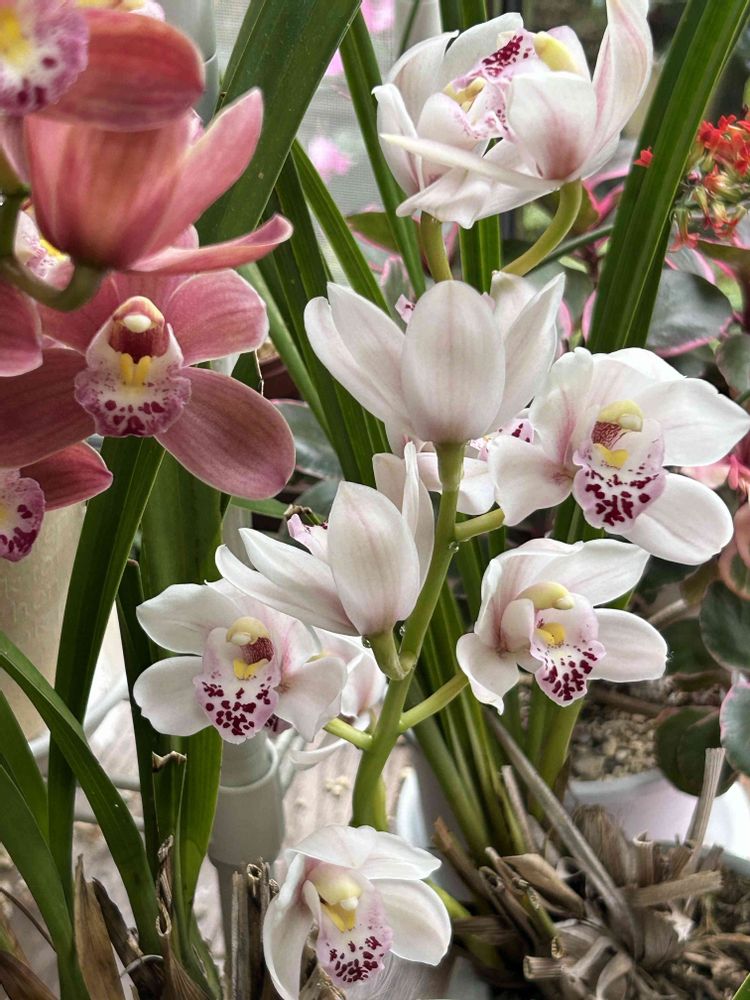 リビング窓辺に置いたシンビジュウムが、薄ピンク花で咲き始めました🤗