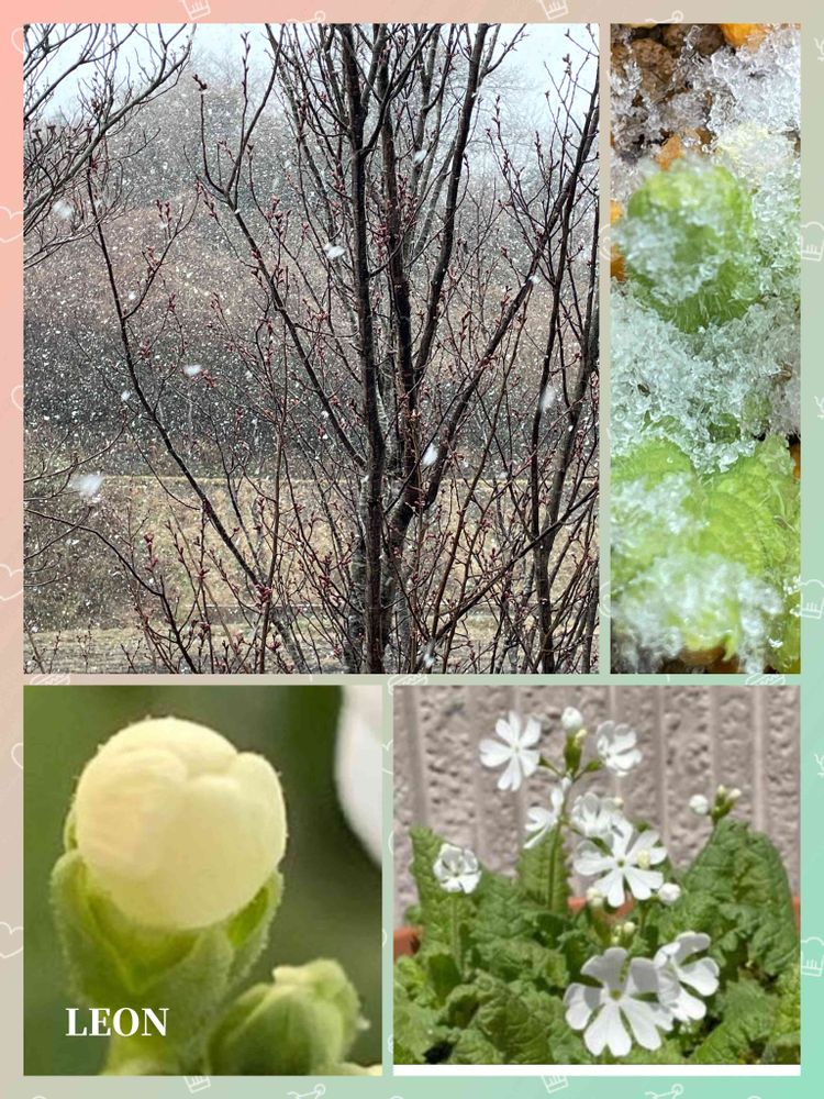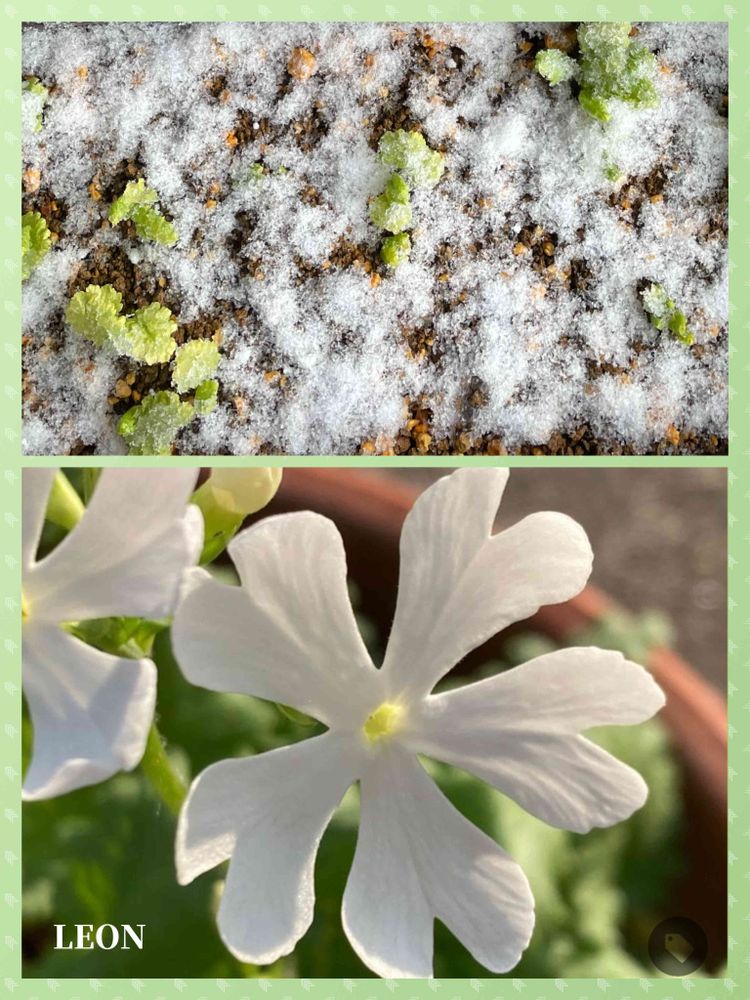 日本桜草に雪が積もり玄関スロープに避難させました🌸🌸