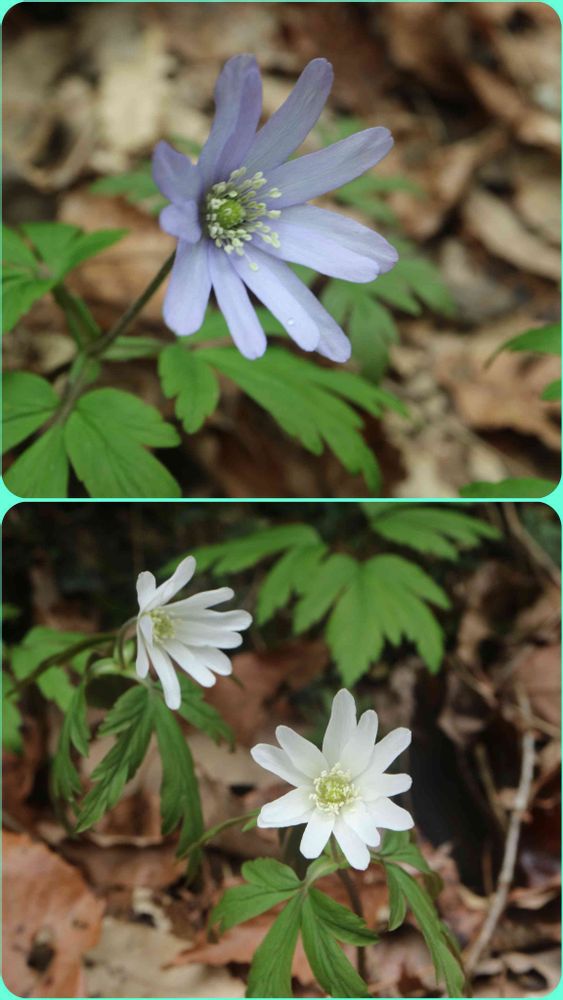 キクザキイチゲ(菊咲一華)キンポウゲ科イチリンソウ属の多年草。別名、キクザキイチリンソウ(菊咲一輪草)。⬆️は青花は今年初めて、⬇️多くは白花です。この日はコノ娘達もうつむき加減。曇天のせいですネ。