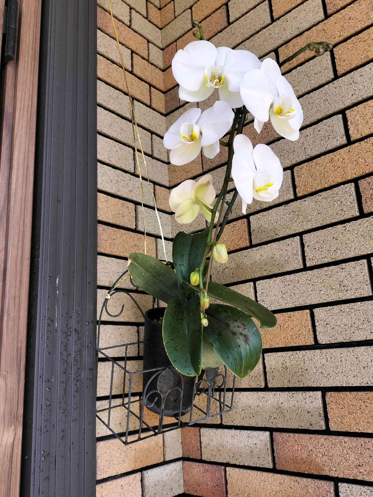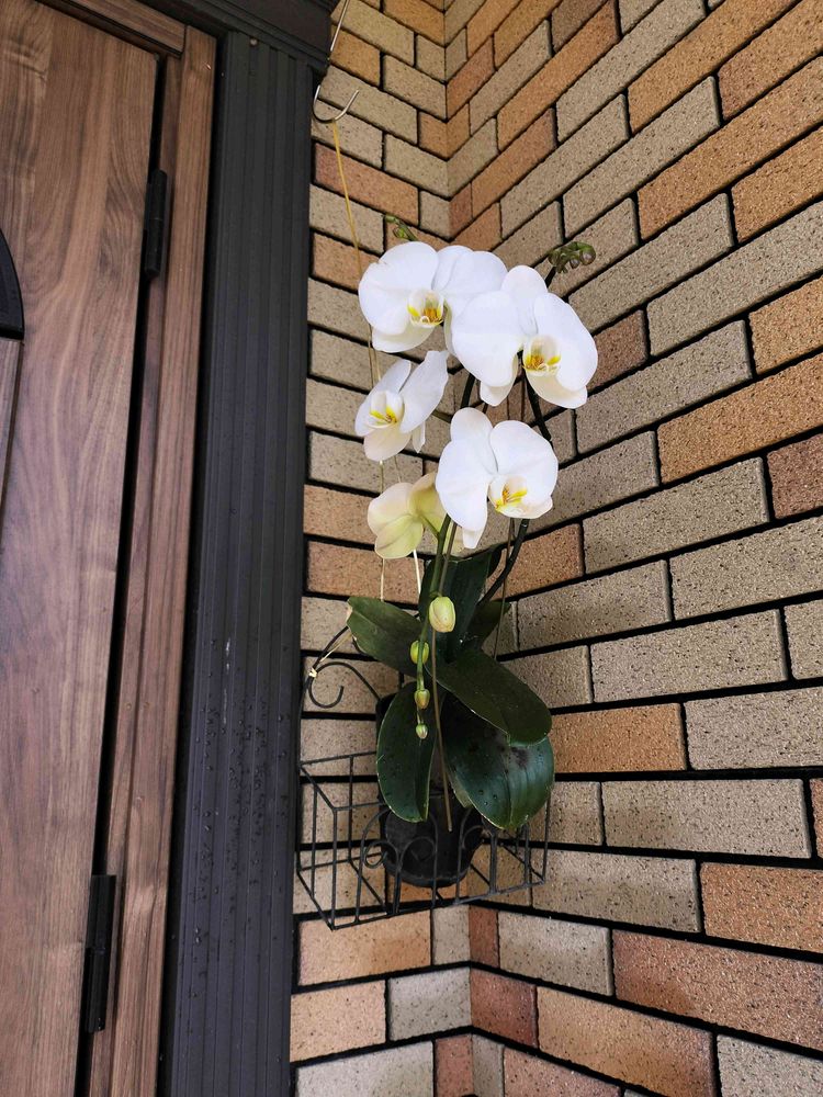 大輪の胡蝶蘭、3株も咲いてると邪魔でしょうがない()ので、今年も1株は外に出させてもらいました。玄関の1番奥に…午後の日差しが葉っぱにかかるようならちょっと日除けします。花茎が枝分かれしてて1番場所をとりそうな子…