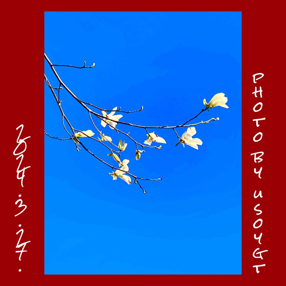 テーマ「快晴」…一点の曇りない春空に純白の「辛夷(コブシ)」が開花していました🤗