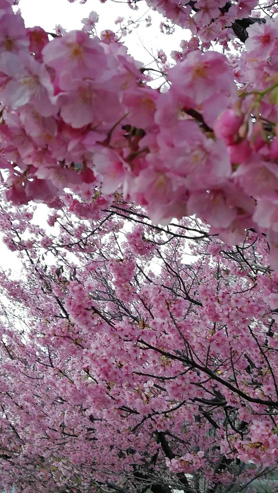河津桜の並木、実際には見たことがありません。