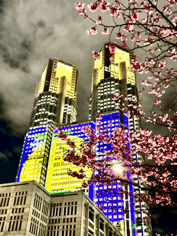 仕事で新宿に行ったので朝と夜の東京都庁の桜を撮ってみました。