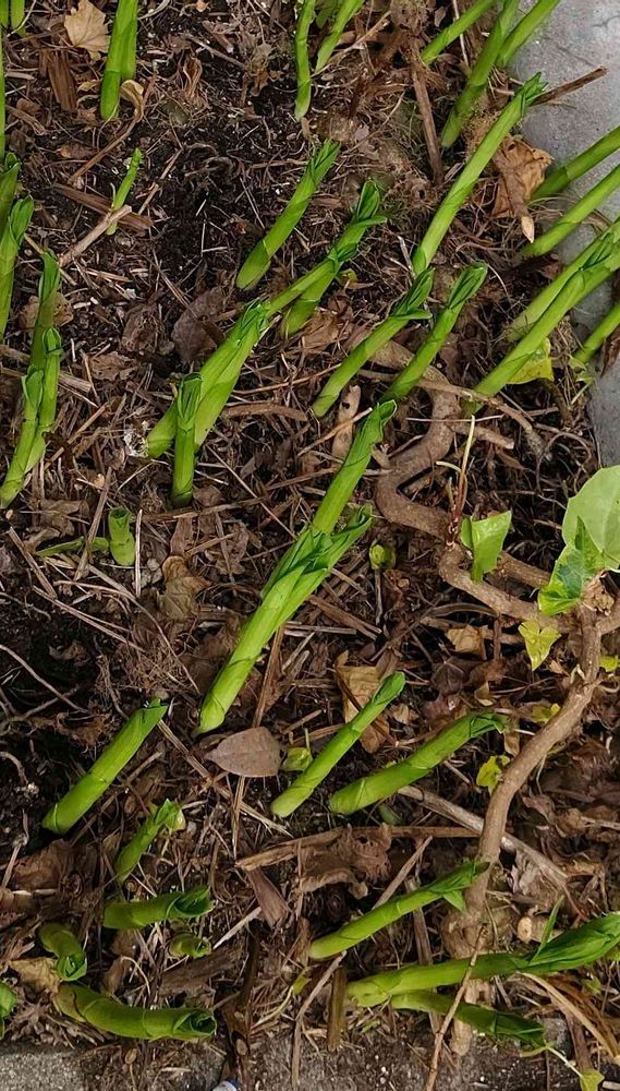 自分「アスパラじゃないよ。シランの新芽だよ」