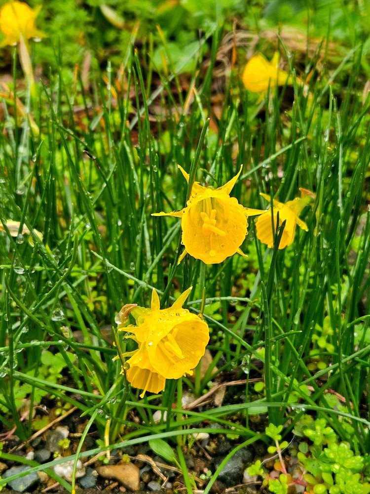 お向かいさんのモッコウバラ??が🌀風と☔雨で散って大変です🫢ネモフィラとハナニラとペチコート水仙が和ませてくれます👍💕
