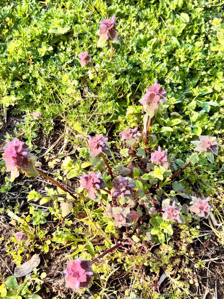ヒメオドリコソウは、花はホトケノザにそっくりですが、スペード形の葉が密に詰まってつき、その間から花が顔をのぞかせるような感じです。