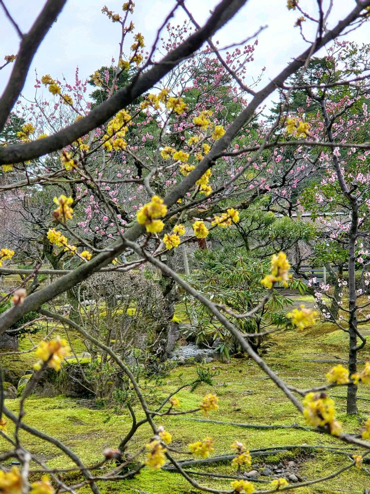 ④⑤壇香梅の黄色💛がバックの摩耶紅梅❤️や豊後梅💗に映えて綺麗です。