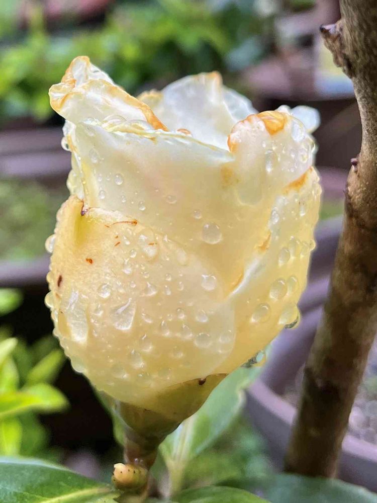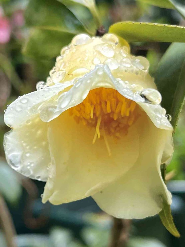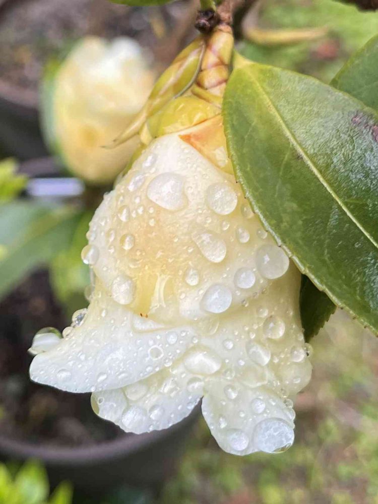 椿・初黄(しょこう)雨風で傷んでしまって、ちょっと痛々しい( × ̫ ×꒦꒷ )