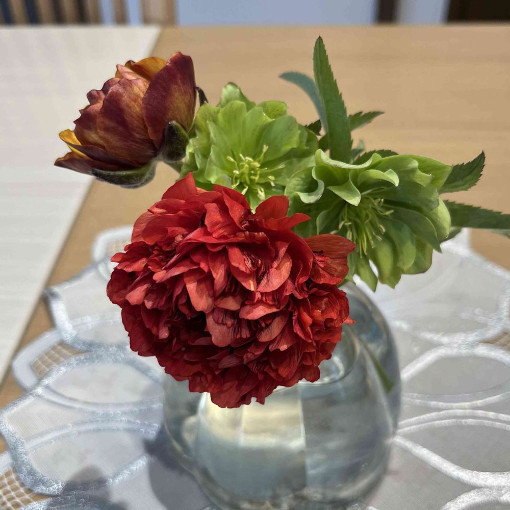 派手派手の赤い花はラナンキュラスのルージュ・ルージュ、そしてグリーンのクリスマスローズを添えて。