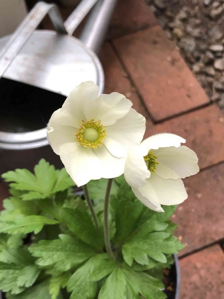 ① 今朝の雨から軒下へ避難中のアネモネさん