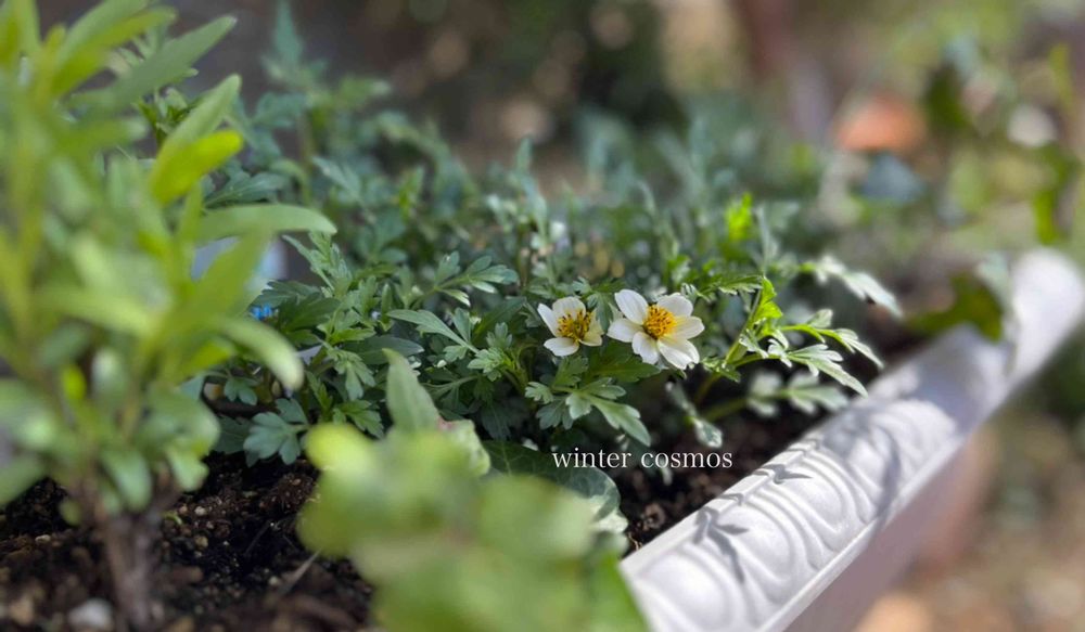秋に咲くコスモスとちがい、逞しい茎や葉を逞しいです🌿昨年秋くらいにお迎えして、寒くなるとお花は終わり、短く切りましまた😉真冬の1、2月が咲かないのかなと🔍ウインターだから真冬に咲くかと思っちゃいますよね❄️初めての冬を超えたので嬉しいです🥰