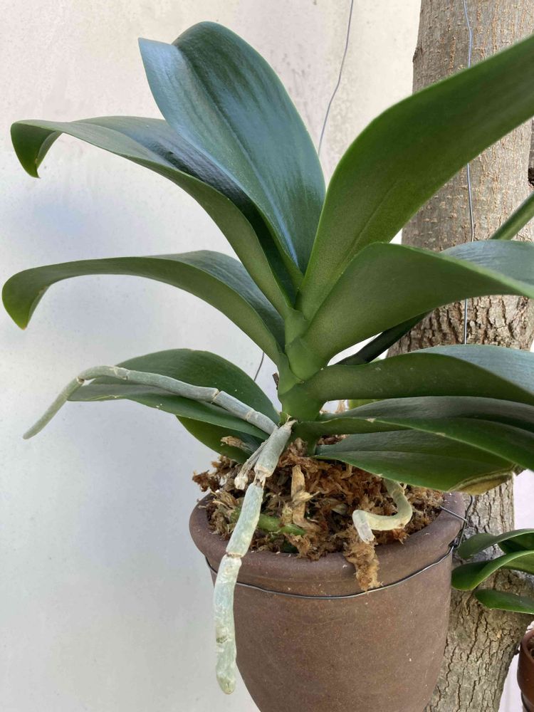 ミディ胡蝶蘭モニターのきみえ、花が終わったので植え替えして、外の木にぶら下げ〜☝️着生蘭の鉢植えは、こうやって夏越ししてます。