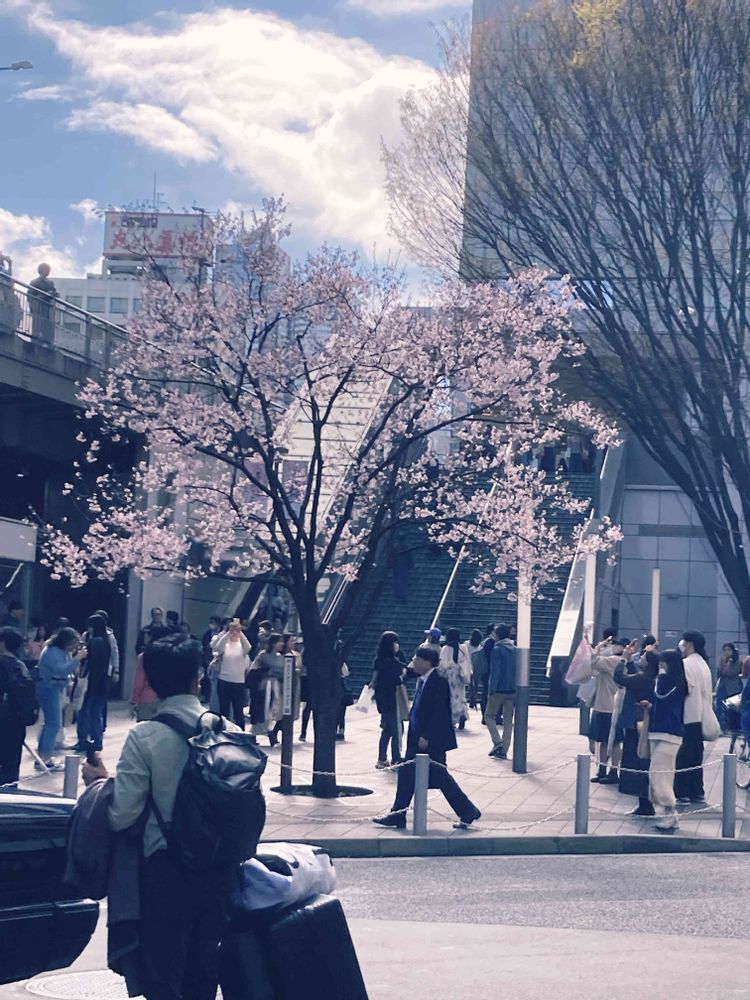 冷えと大雨と大風の後、グッと気温が上がって蒸し暑くなった都心の午後、桜の開花に遭遇しました。周りは写真を撮る人でいっぱいでした。