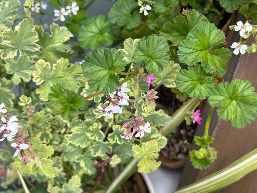薄ピンク色はナツメグゼラニウム、白はアップルゼラニウムの花です🥥🍎