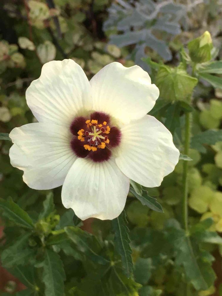淡いクリーム色の花弁の付け根は 紫色の丸い模様🎶