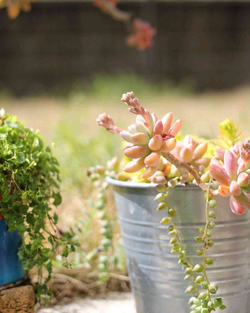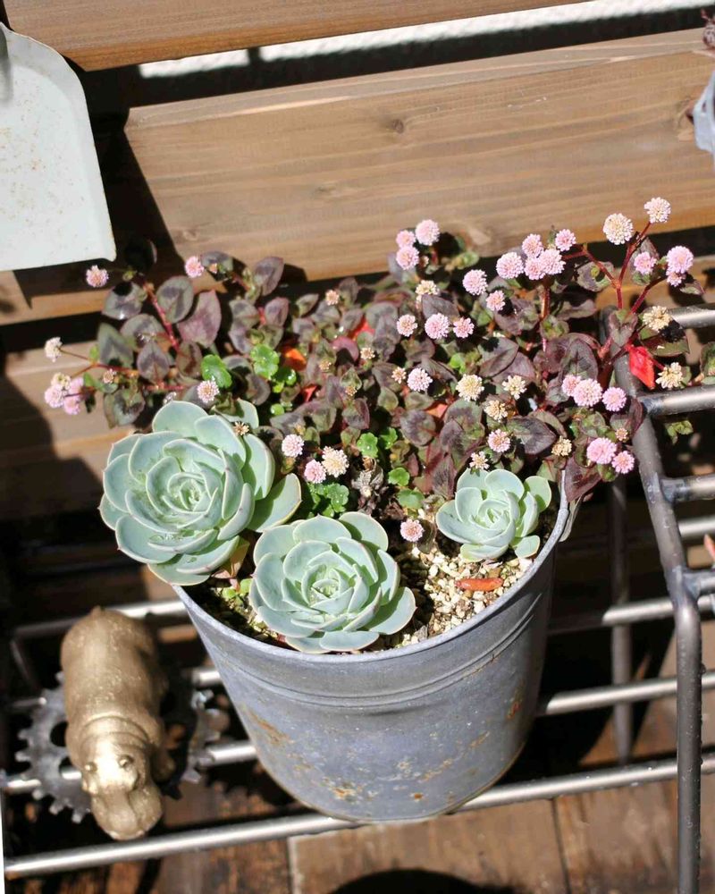 七福神の鉢にいつの間にかポリゴナムとシンバラリアのこぼれ種が発芽して咲いてる…