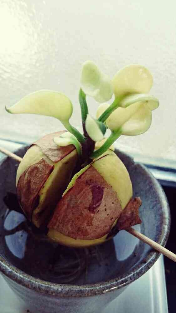 さん、はい♪アボカドの芽が緑ではなく今回は白い芽が出てきたんです(゜▽゜*)もう少し成長したら土に植えたいと思っています!