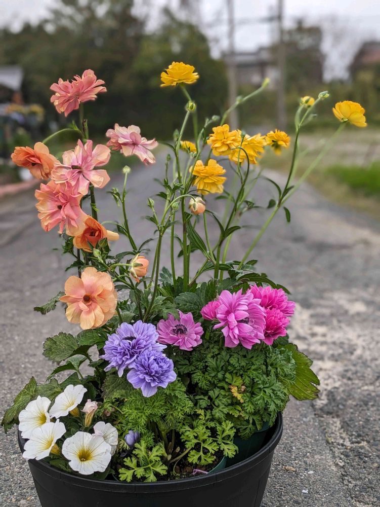 ④大きめの鉢にミネルバ、キュベレー、アネモネ、ペチュニアを入れてみました😅寄せ植え苦手な私😰すぐに取り出せるようポットorスリット鉢のままです。