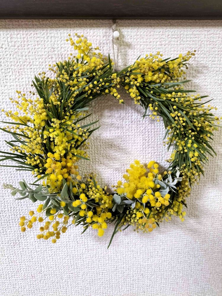 その後、細葉のミモザをそのまま丸めてリース作り💛