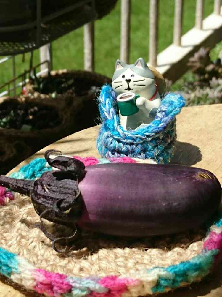 ベランダの茄子の一個目👀コーヒー☕で祝う🐱ちゃん