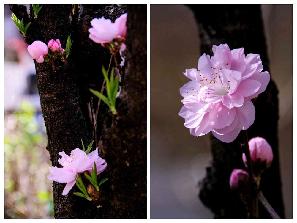 幹から顔を覗かせて可憐に咲く花桃 とっても美しいですねぇ✨🎶