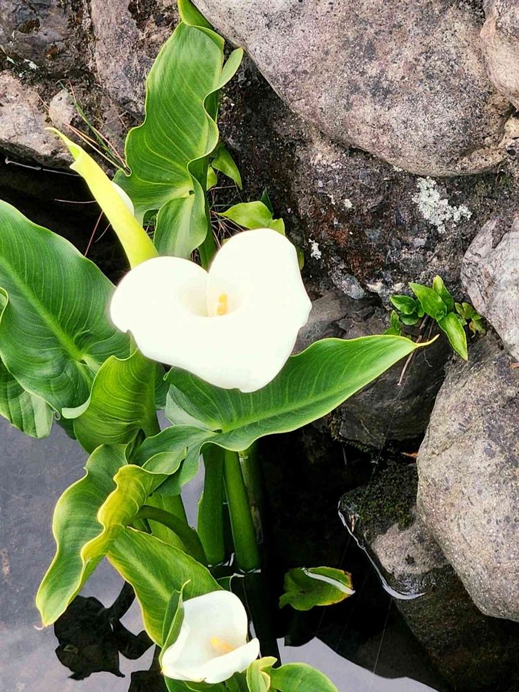 ③湧き水の水路に咲くカラー