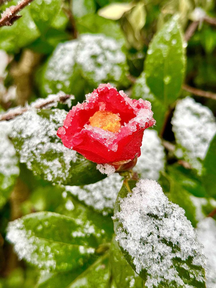 【椿】庭の椿。3月26日撮影。雪は降っても全然構わない。黄砂とか花粉は降って欲しくない。特に黄砂の日はマスクした方がいいのにね。肺に黄砂入れてお花見とかしてる人、頭にもお花咲いてるのかな。