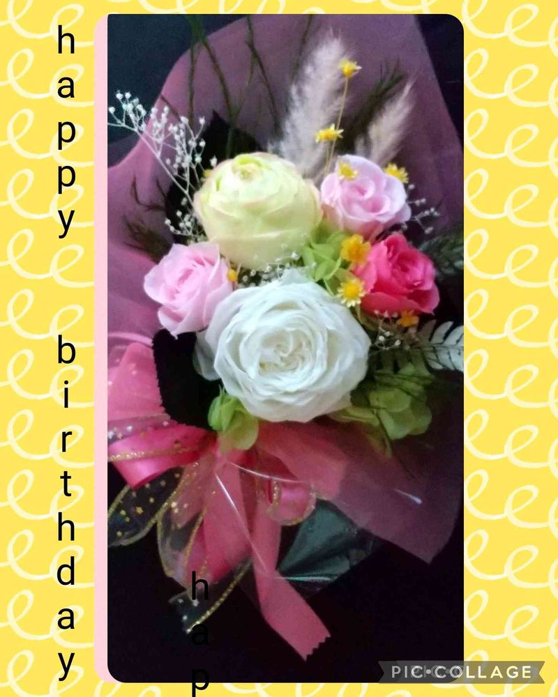 お誕生日おめでとうございます🎵🎶プリザーブドフラワーを使用してバラの花の💐ブーケをお作りさせて頂きましたのでお受けとりくださると嬉しいですワア~❤️