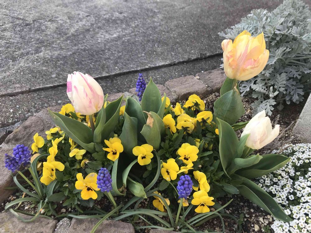 おはようございます☀今日も良い天気☀️ はじめ二頭身みたいだったチューリップ だんだん背を伸ばしてきました パンジーとダブルデッカーで植えました🌸