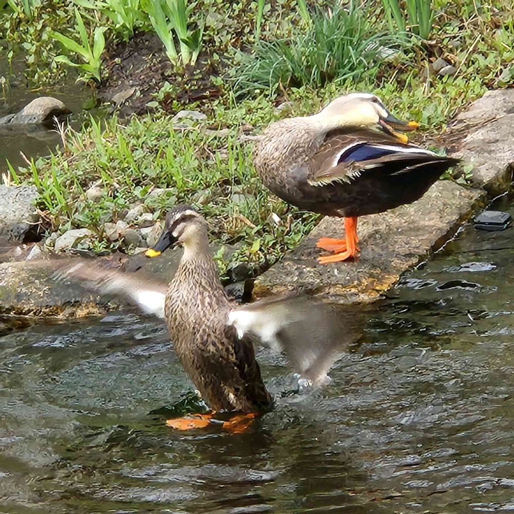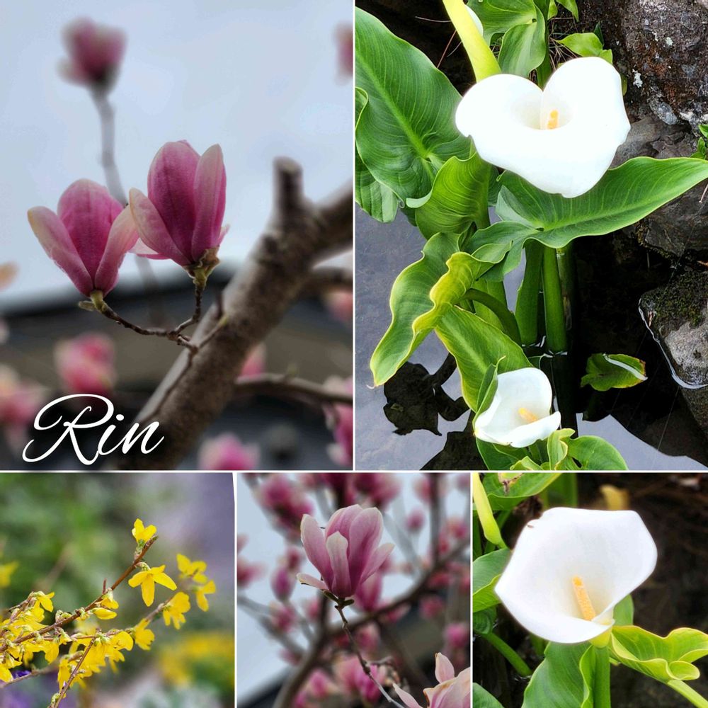 ②紫木蓮と湧き水の水路に咲くカラーなど