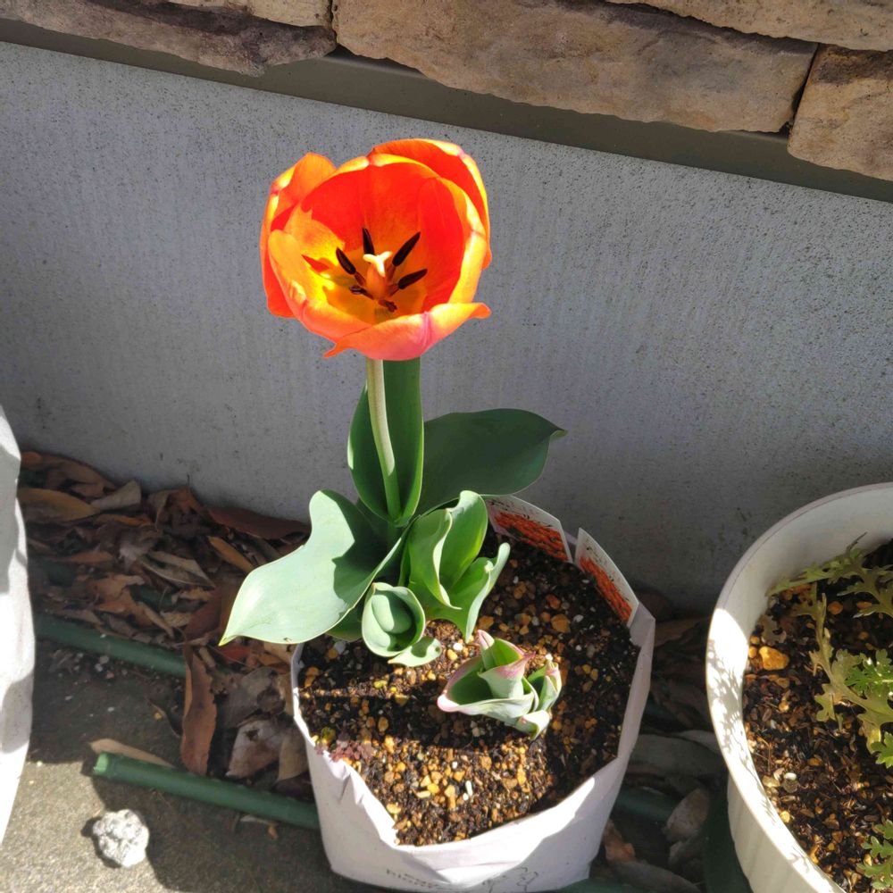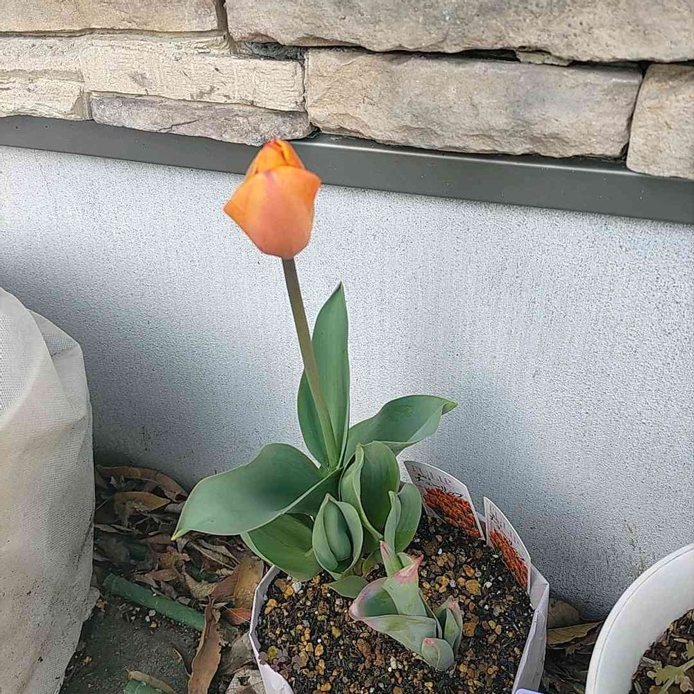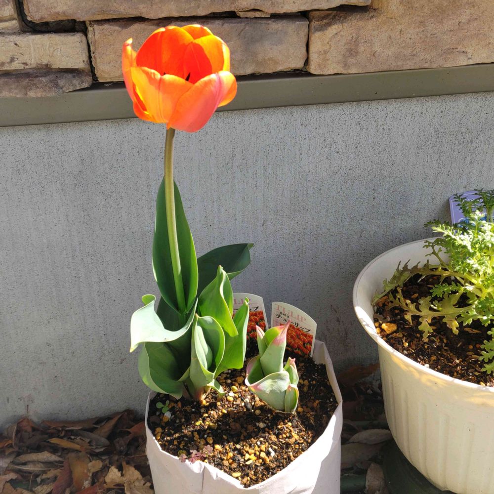 2つ同時に植えたのに手前のチューリップはなかなか大きくなりません😨