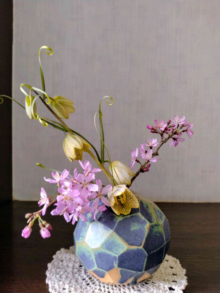 桜もバイモユリも素敵ですただこの花器にこの花材を組み合わせるならバイモユリが長過ぎます。バイモユリをメインに見せたいならシンプルな色の器の方が花が映えます。この器と短く入れた桜がとてもいいと思うのです。