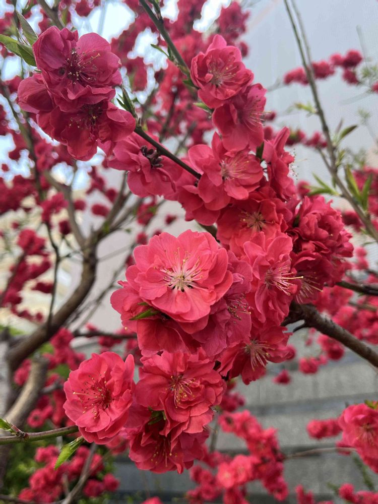 4月もよろしくお願いします☺️ 快晴で暖かいです☀️1️⃣赤色が鮮やかで 綺麗に咲いてました🎶 調べたら桃の花でした😁赤もあるんですね〜💦 2️⃣から4️⃣買い物帰りに😊桜が咲いていて嬉しかったです✨綺麗〜❣️