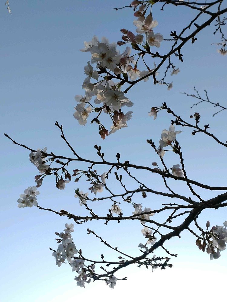 早朝の晴れ渡った薄い青空に、朝陽が薄っすらと当たって光に透けた花びらが映えて綺麗だわ~🥰