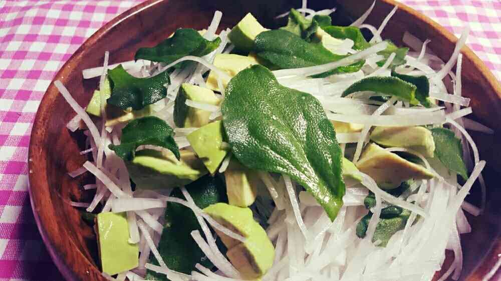 頂き物の夏大根と庭先に植えてるアイスプラントと冷蔵庫にあったアボカドでサラダ♪