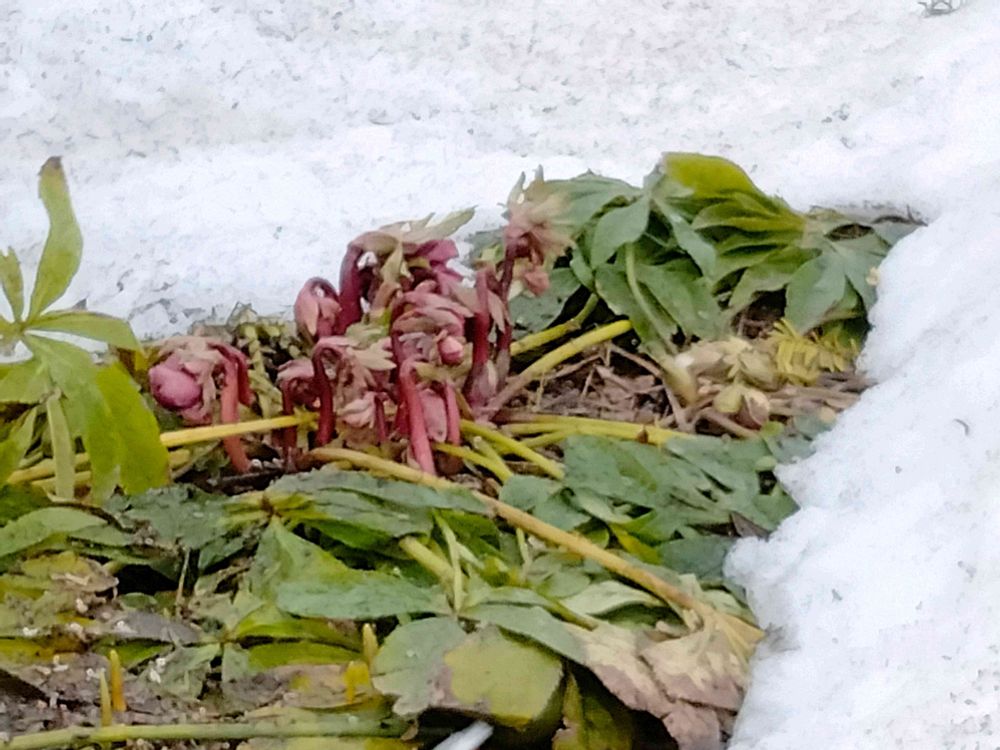 木の下だからかクリスマスローズの生命力の力なのか、雪が溶けた下からこんなに蕾を立ち上げて出てきたよ