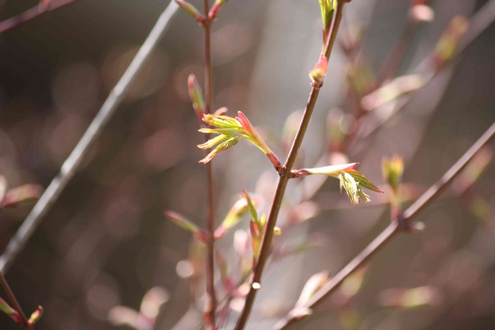 開きかけた若葉が鳥の翼のようだったり、もうすっかりモミジ葉の形になっている枝もあります。