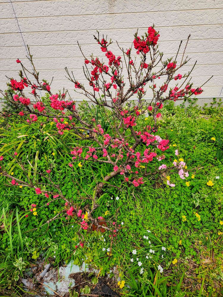 小さな木に~真っ赤な花桃❣️とピンク色の花桃💞がびっくり👀咲いていました~🤗