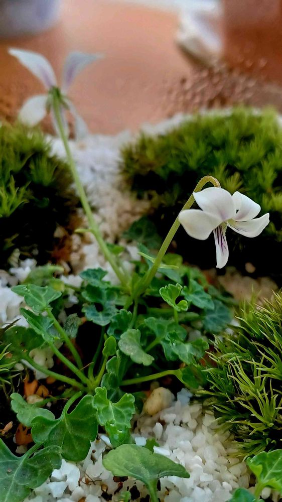 屋久島スミレの花、小指の爪くらいの大きさでしょうか、苔テラリウムの中で育っているせいか、若干小さめです(^^)