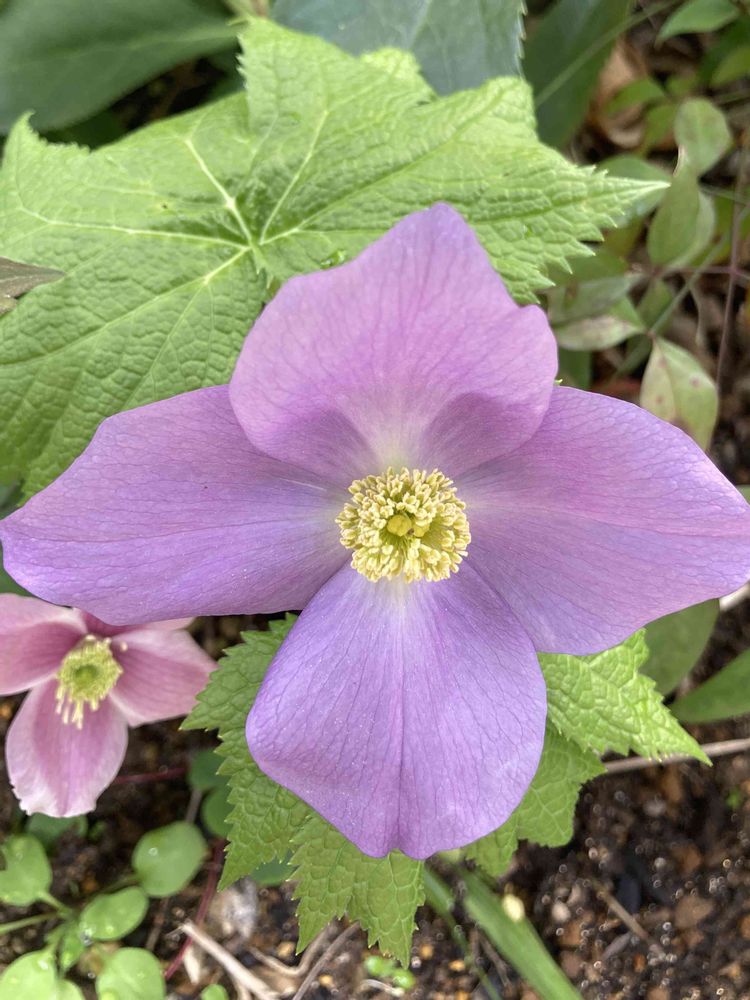 シラネアオイが咲きました。3枚目左下はクレマチス・モンタナがこっそりと写っています。