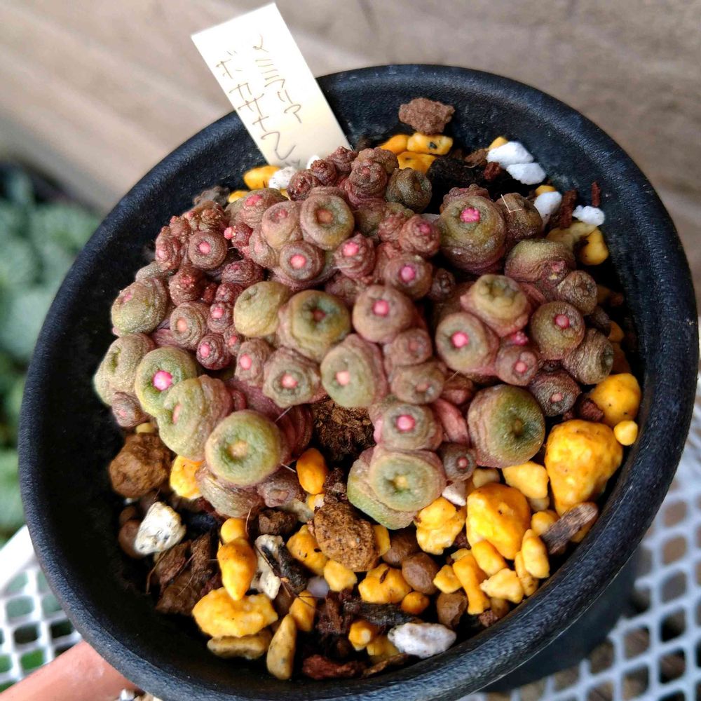 でも、たまに先祖返りするらしく、そうすると途中から普通のマミラリアになって、そこだけトゲも生えて花も咲くというカオスなことになるようで。