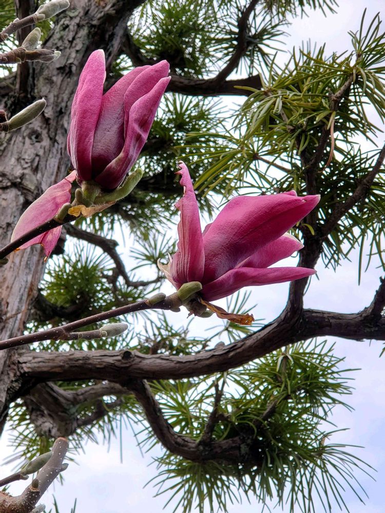 ③紫木蓮が大きく咲いています。高野槙の緑とのコントラストが綺麗です。