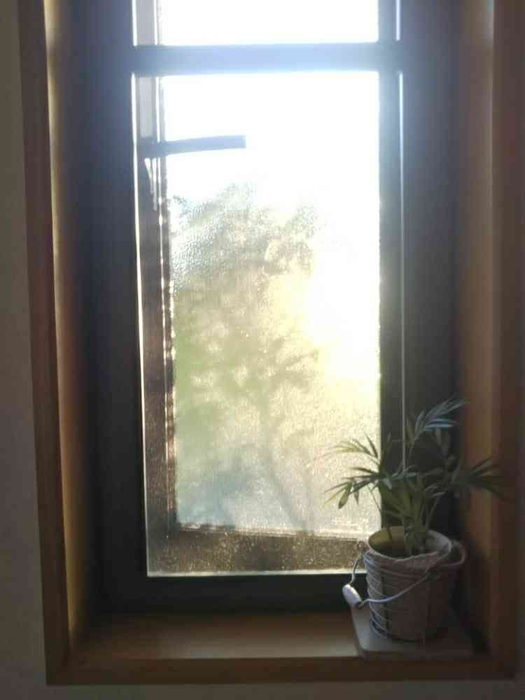 テーブルヤシを置いてある窓の夕陽越しに映る南天のシルエットが綺麗だったので撮ってみました。🌇
