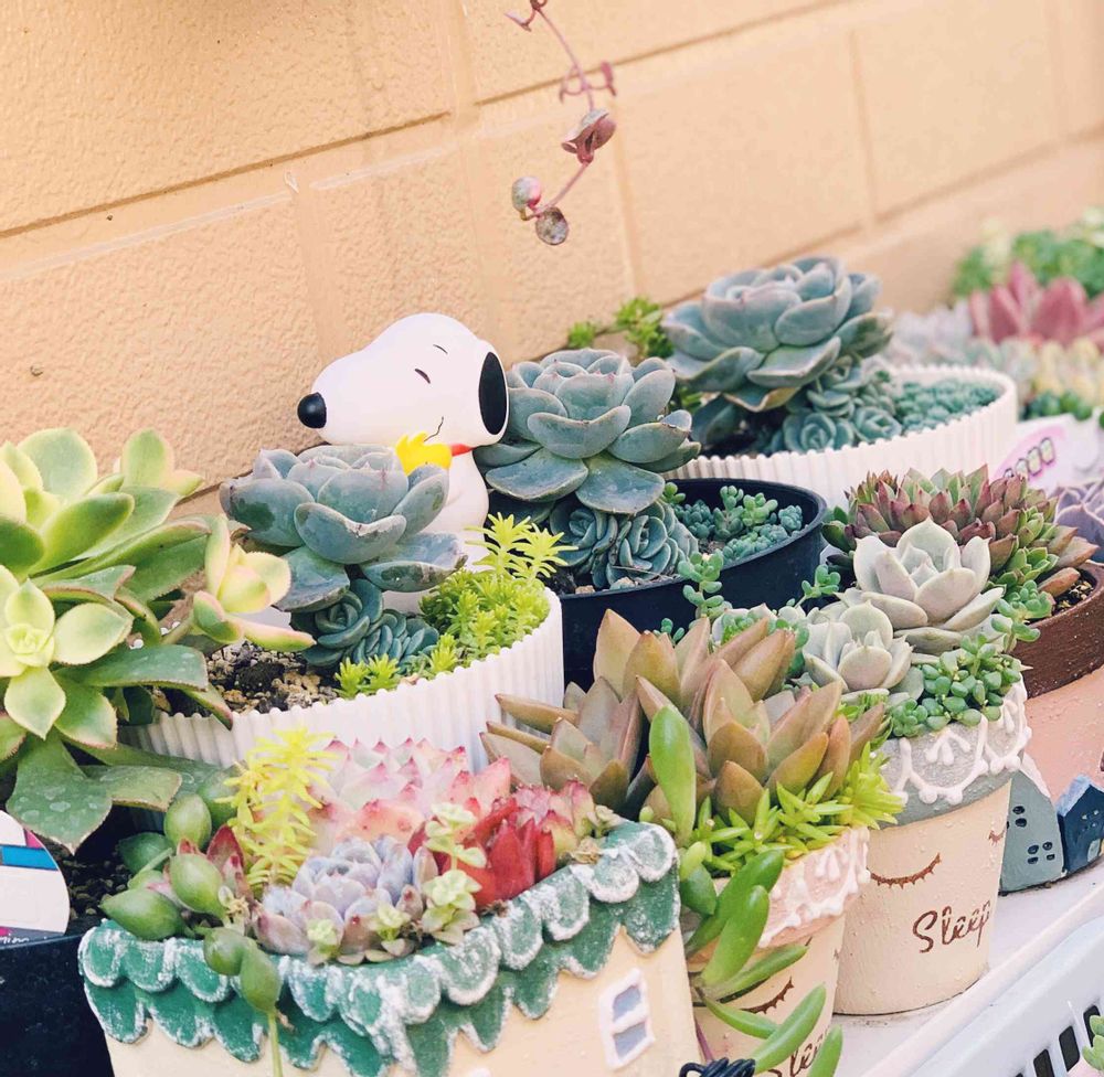 可愛いリメ鉢さんと可愛い多肉ちゃんに囲まれて幸せそうなスヌーピー❣️